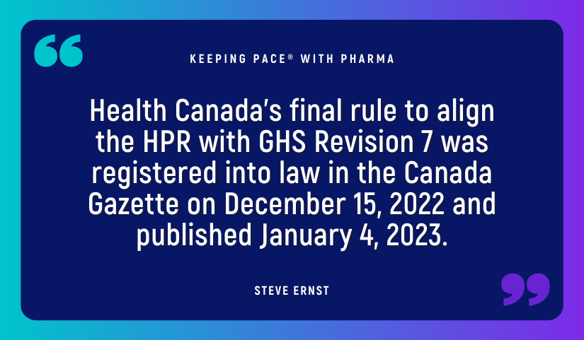 In December 2020, Health Canada recommended amending the HPR to bring it into alignment with the 7th Revision of the GHS. While the update has some variances, it largely mirrors the changes suggested by the United States in its parallel effort to update the OSHA Hazard Communication Standard (HCS; Docket No. OSHA-2019-0001). The initial public comment period for Canada’s proposed amendment to the HPR ended in February 2021, the same month the United States published a proposed rulemaking to update the HCS to align with the 7th Revision of the GHS. Canada’s public comment period was extended till May 2021, which coincided with the deadline for submitting comments on the United States’ proposed rulemaking, as well. Health Canada’s final rule to align the HPR with the 7th Revision of the GHS, SOR/2022-272, was registered into law in the Canada Gazette on December 15, 2022 and published January 4, 2023.
